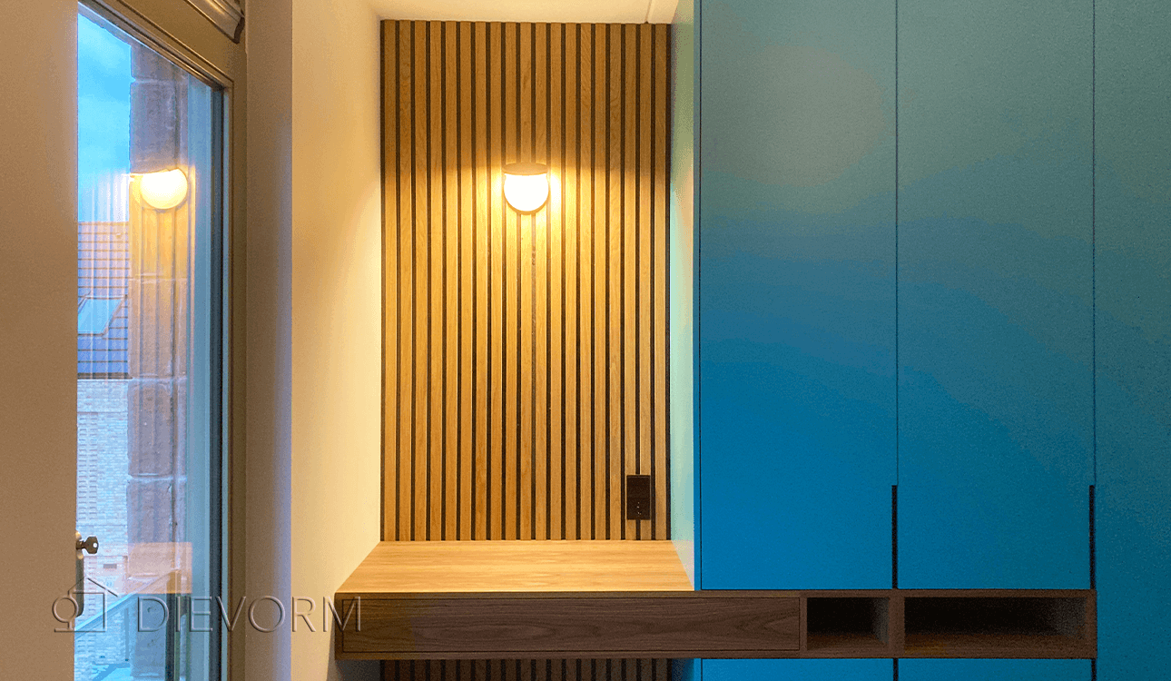 Het resultaat is een moderne design kastenwand. Het is een spannend ontwerp door de houten latten op de achterwand, in combinatie met het bureau dat doorloopt in de kastenwand. De kleur toont lef aan en de combinatie blauw met hout is prachtig.