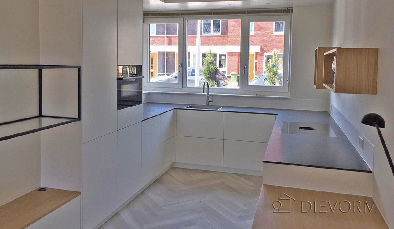 We starten met de L-vormige opstelling. L-vormige keukens zijn een van de meest gebruikte keukenopstellingen in Nederland. En dat is niet voor niets. Met een keuken in een L-vorm haalt u het maximale uit de ruimte met veel opbergmogelijkheden. Daardoor is een L-keuken geschikt voor zowel kleine ruimtes als grote ruimtes.